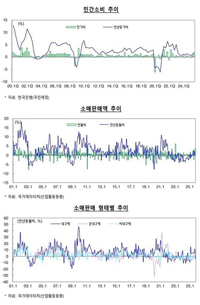최근 국내 경제는 내수 부진이 이어지며 체감경기 개선 속도가 더딘 모습이다. 소매판매는 일부 품목을 제외하고 전반적으로 약세를 보였고, 서비스 소비 역시 뚜렷한 반등 신호를 보이지 못했다. 설비투자와 건설투자도 기업의 투자심리 위축과 건설 경기 조정 영향으로 감소세 또는 정체 흐름을 이어가며 내수 회복을 제약하고 있다.