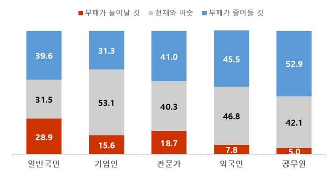 전년과 비교하면 기업인(43.6%→32.7%), 전문가(53.8%→44.4%), 공무원(12.8%→5.3%), 외국인(14.5%→8.8%) 등 일반국민을 제외한 모든 집단에서 ‘우리 사회가 부패하다’는 인식이 개선됐다. 반면 일반국민은 57.1%에서 57.6%로 0.5%p 증가했다.